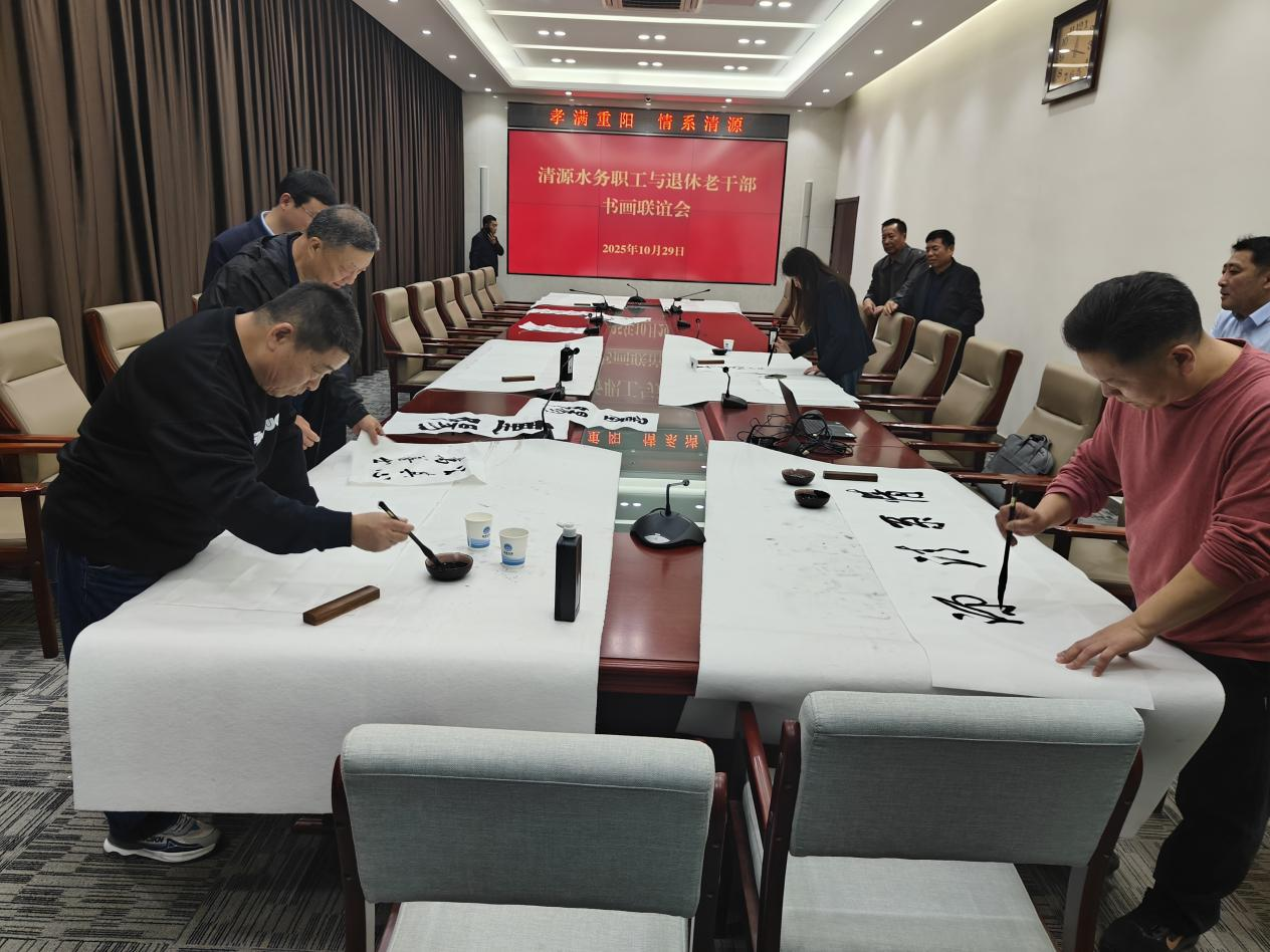 ? ? ? ?活動第二站,來到聚源公司文山泵站開展書畫聯(lián)誼活動,活動室內(nèi)墨香四溢,長桌鋪展,宣紙備齊,公司書畫愛好者與老同志們一同揮毫潑墨,即興創(chuàng)作。大家寫下對企業(yè)和生活的感悟,既展現(xiàn)了清源人對文化的熱愛,亦營造了和諧融洽的交流氛圍。